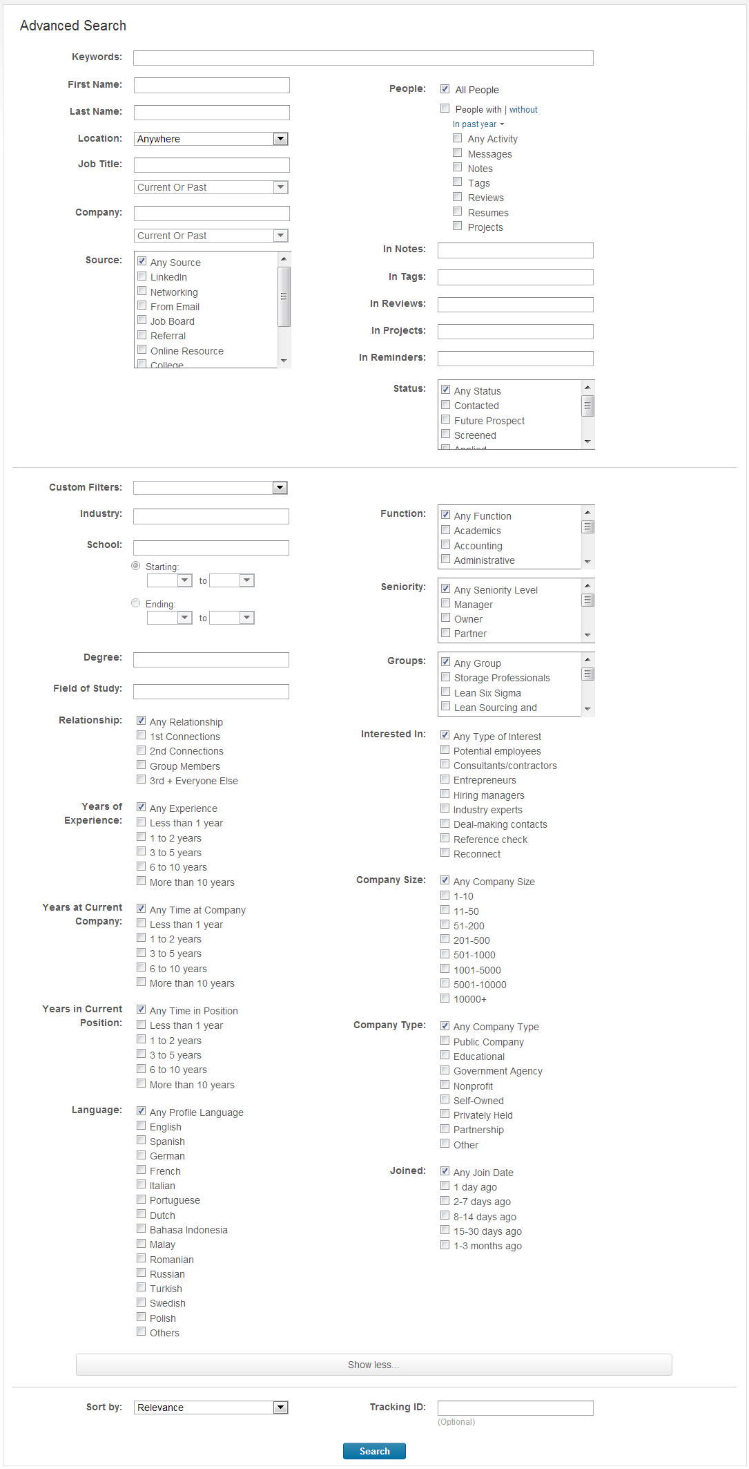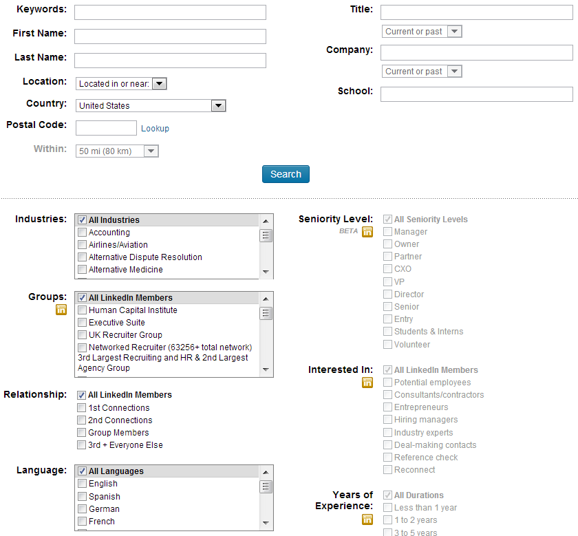 When you start stepping up to the premium LinkedIn accounts, Facebook’s Graph Search pales in comparison. For those of you who don’t have access to LinkedIn Recruiter – here’s the full search interface: