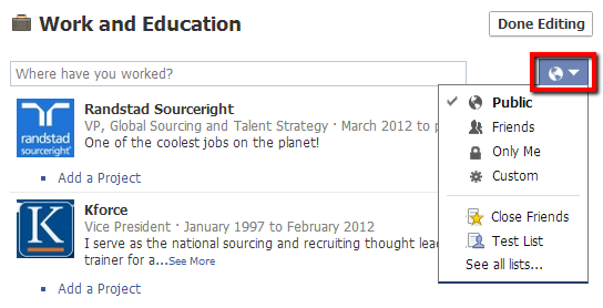 If you’re not a Facebook privacy settings expert – here’s where you can set the privacy for your work history: